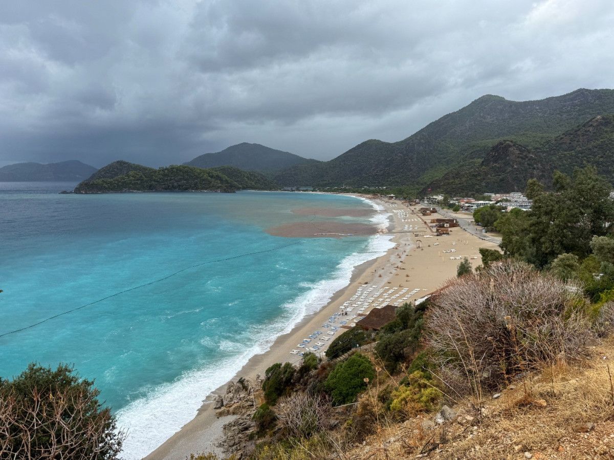 Şiddetli yağışın ardından Ölüdeniz’in simgesi haline gelen turkuaz sular ise çamurla karışarak kahverengiye döndü.