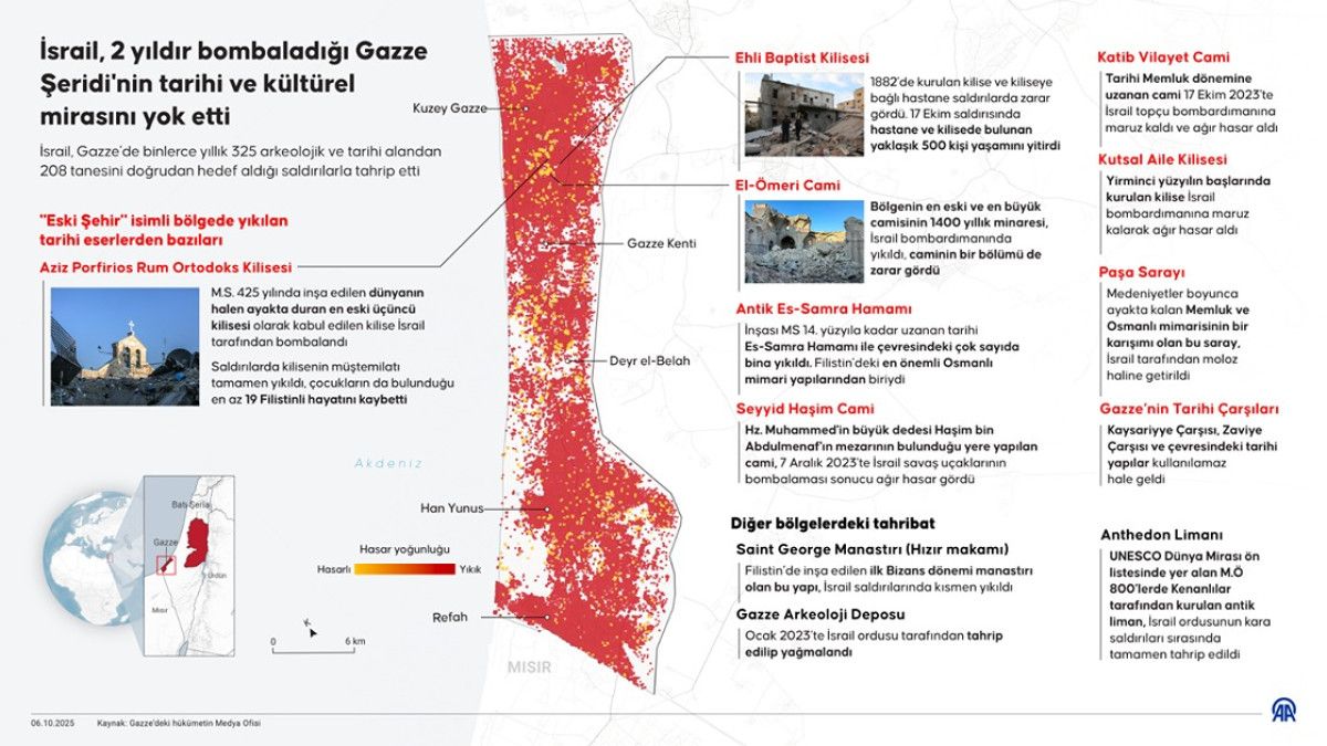 İsrail ordusunun saldırıları sadece sivilleri değil, Gazze’nin binlerce yıllık tarihi ve kültürel mirasını da hedef aldı. Gazze Hükümeti Medya Ofisi verilerine göre, 2 yılda 325 arkeolojik ve tarihi alandan 208’i doğrudan saldırılarla tahrip edildi.