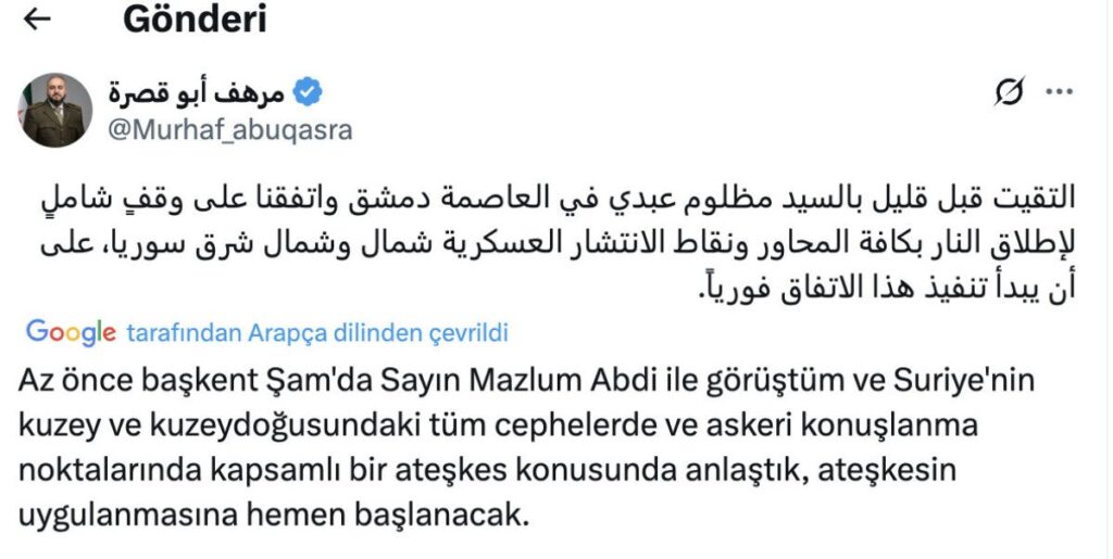 X açıklamasında, “Şam’da Mazlum Abdi ile görüştüm ve Suriye’nin kuzeyi ile kuzeydoğusundaki tüm cephelerde ve askerî konuşlanma noktalarında kapsamlı bir ateşkes konusunda anlaştık; bu anlaşmanın uygulanmasına derhal başlanacaktır.” dedi.