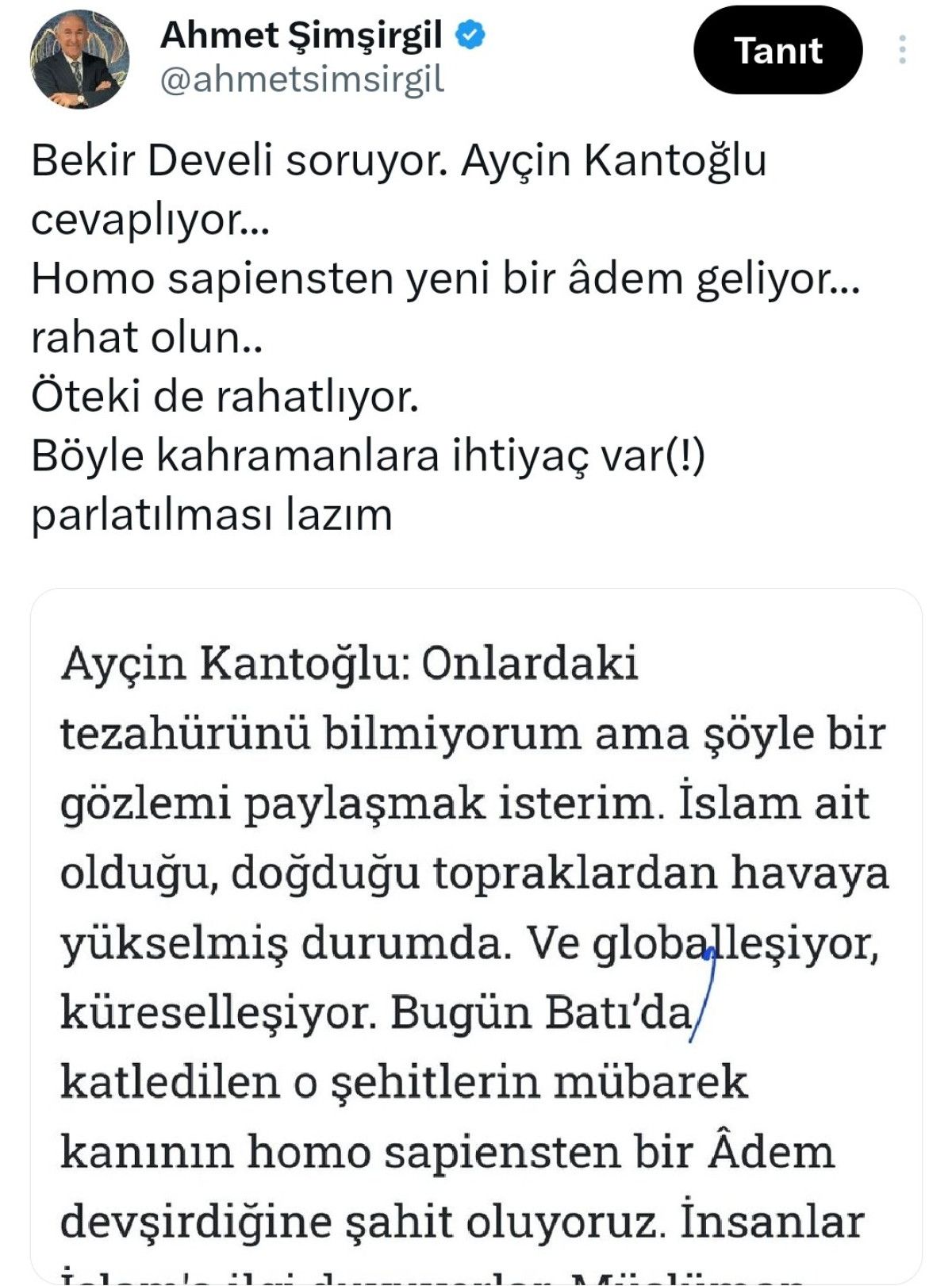O Kantoğlu denen kadın konuşuyor. İslam diyor havaya kalktı diyor doğudan. E homo sapiens mi ne o? Yeni bir Adem gelecek diyor. Şimdi evrimden yeni bir Adem mi bekleyeceğiz biz? Bekir Develi de gülüyor. Orada erkeklerle yata kalka, yata kalka, o fotoğraflarına kusura bakma ya, hangi cihattan bahsediyorsun? İşinde dini şeylerin içini boşaltmamak lazım. Sen gitseydin ya meselesi değil. O sadece fitne çıkartmak noktasına gelir, devlet yapar cihadı. Önce cihadın ne olduğunu anlayın.