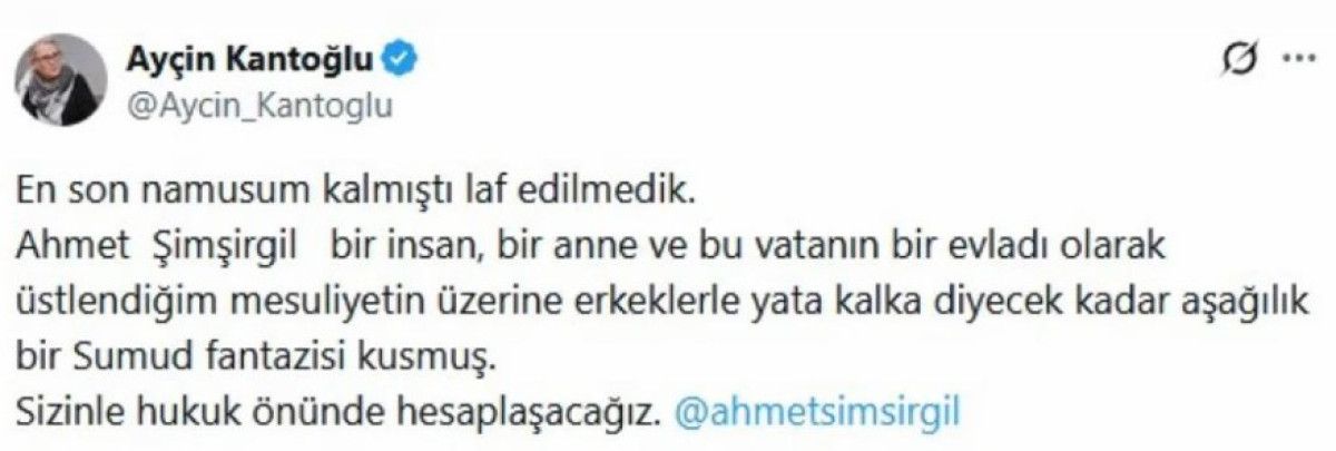 En son namusum kalmıştı laf edilmedik. Ahmet Şimşirgil bir insan, bir anne ve bu vatanın bir evladı olarak üstlendiğim mesuliyetin üzerine erkeklerle yata kalka diyecek kadar aşağılık bir Sumud fantazisi kusmuş. Sizinle hukuk önünde hesaplaşacağız.