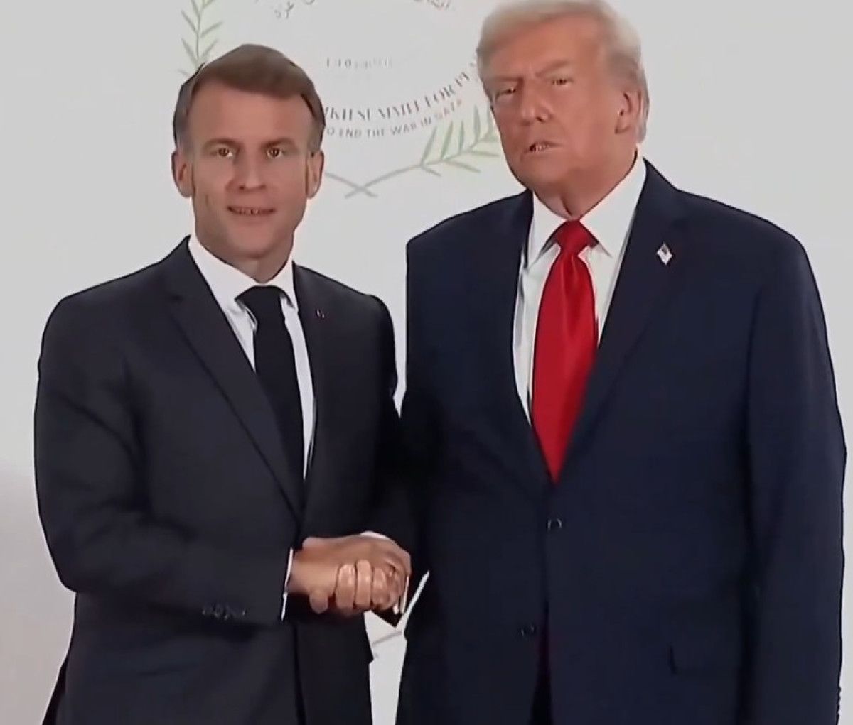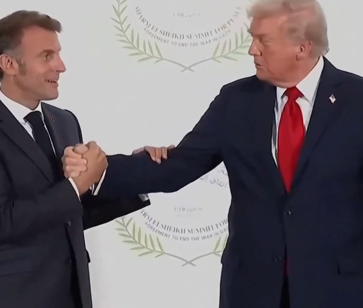 Macron, Trump’ın eline dokunup “Affedersin” diyerek elini çekmeye çalışıyor ama Trump, Macron’un elini daha da sıkıştırıyor.