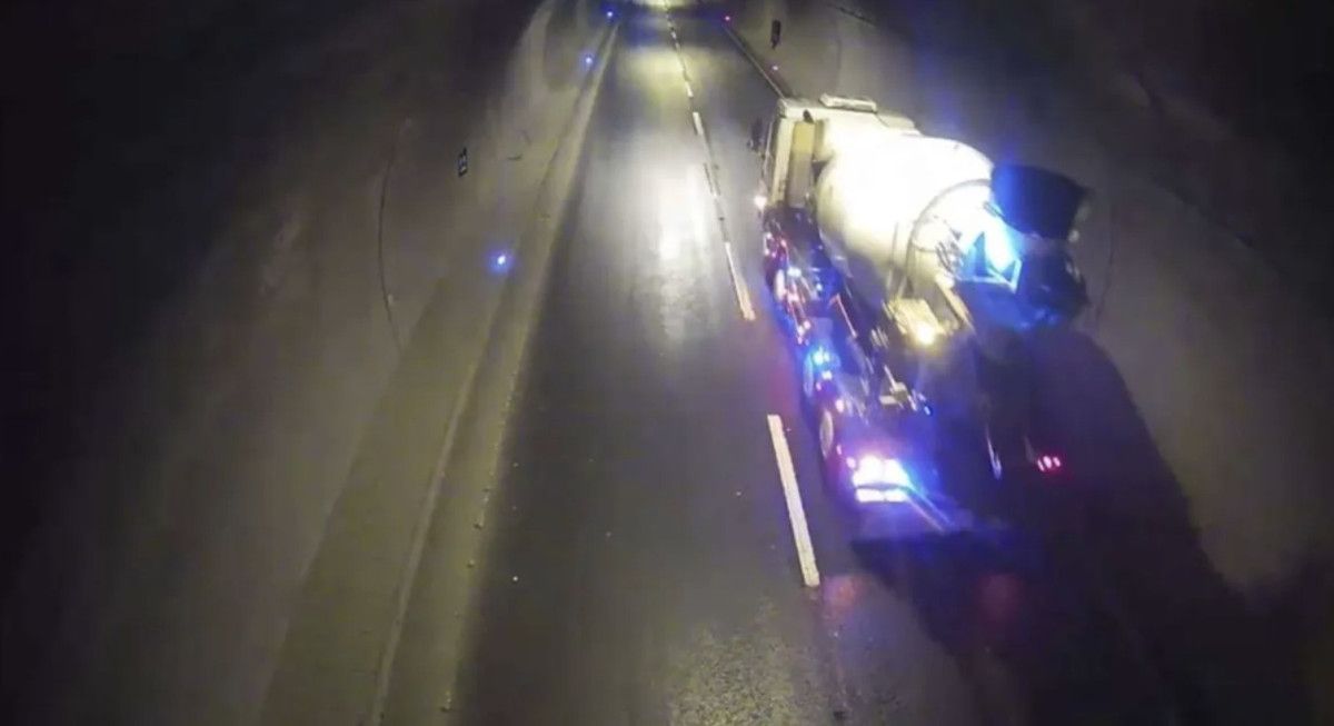 Tünelde sağa çekilmiş ve polis arkadaşımız orada trafiği tek şeride yönlendiriyor.