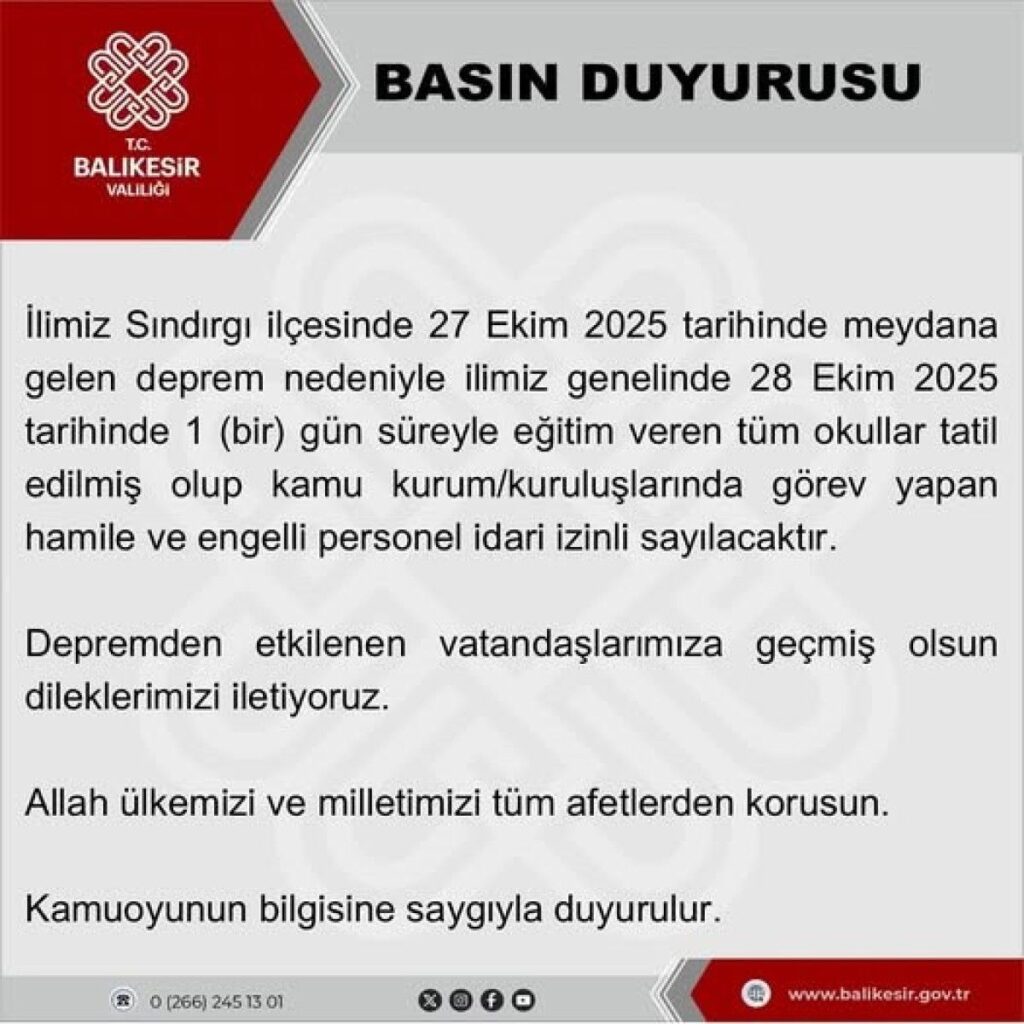 “Deprem nedeniyle il genelinde 28 Ekim’de bir gün süreyle eğitim veren tüm okullar tatil edilmiş olup kamu kurum ve kuruluşlarında görev yapan hamile ve engelli personel idari izinli sayılacaktır. Depremden etkilenen vatandaşlarımıza geçmiş olsun dileklerimizi iletiyoruz. Allah ülkemizi ve milletimizi tüm afetlerden korusun.”