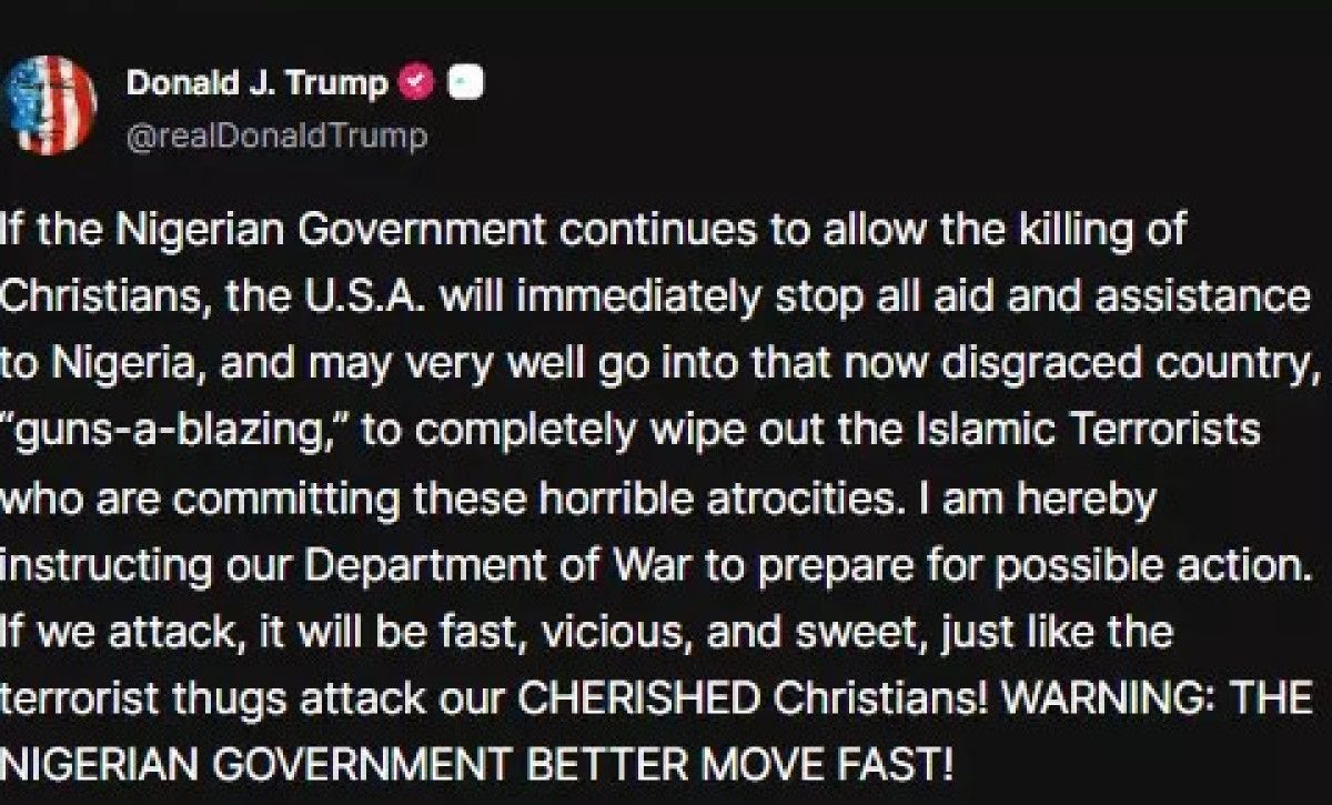 Kendisine ait Truth sosyal medya platformundan bir paylaşım yapan Trump, Nijerya hükümetinin Hristiyanların öldürülmesini engellemesi gerektiğini vurgulayarak, “Eğer Nijerya hükûmeti Hristiyanların öldürülmesine izin vermeye devam ederse, ABD derhal Nijerya’ya yapılan tüm yardım ve desteği kesecek. Ayrıca itibarını yitirmiş bu ülkeye silahlı müdahalede bulunarak bu korkunç zulümleri işleyen teröristleri tamamen yok edebiliriz” uyarısında bulundu.