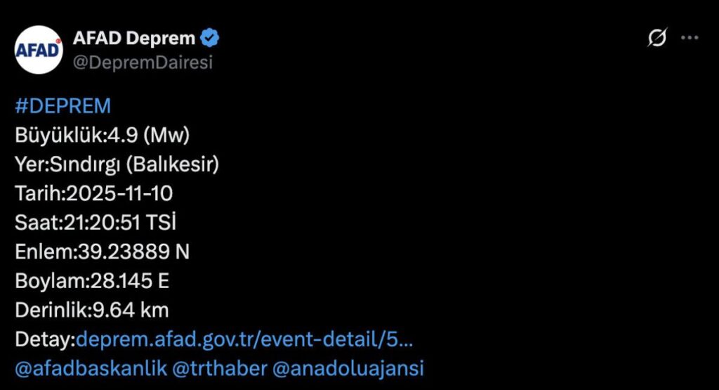 Afet ve Acil Durum Yönetimi Başkanlığının (AFAD) Balıkesir Sındırgı’da saat 21.20’de 4.9 büyüklüğünde bir deprem meydana geldiğini duyurdu.