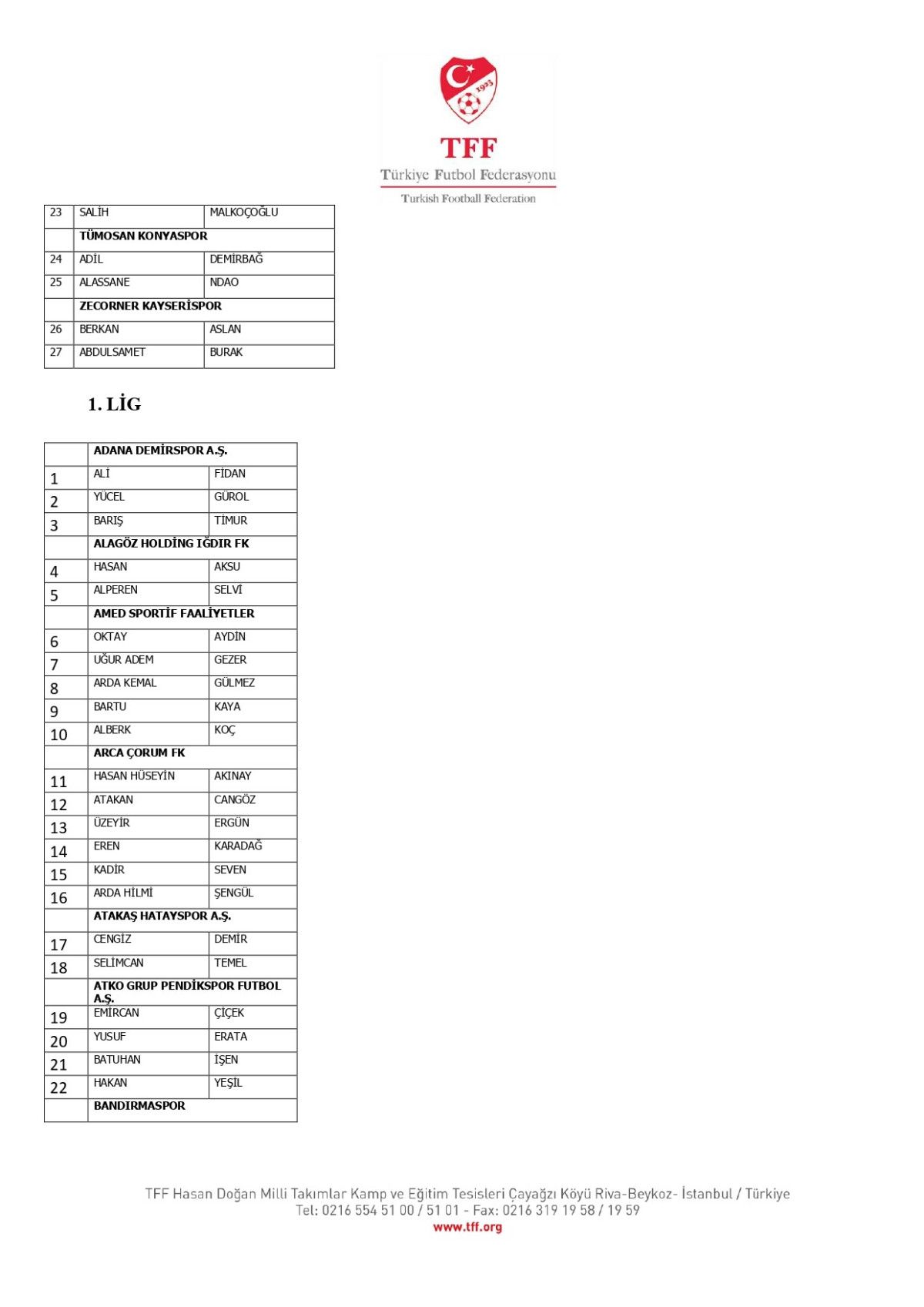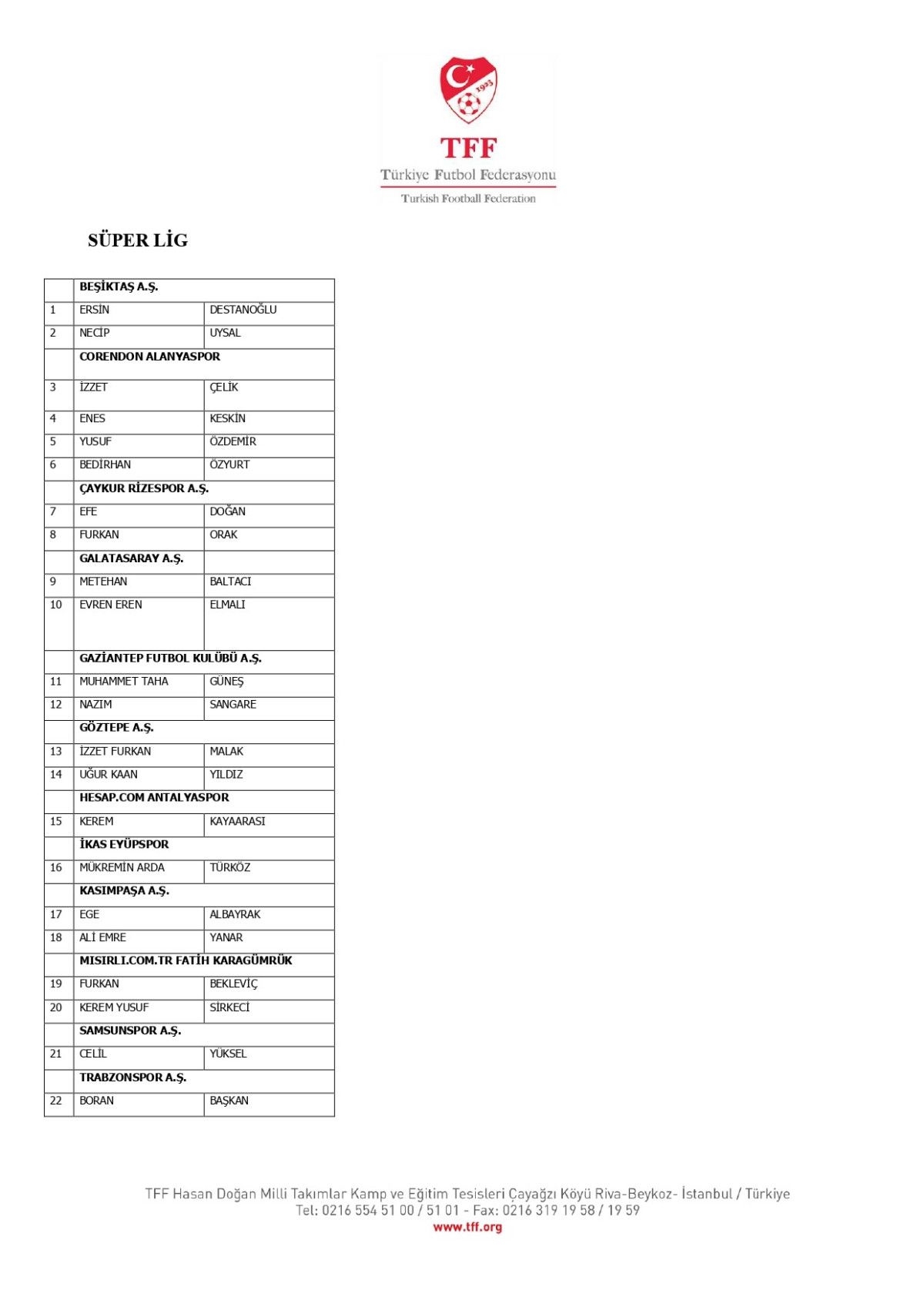 Sevk edilenler arasında Süper Lig’den 27 futbolcu yer aldı. TFF’nin açıklamasında 14 Süper Lig takımının oyuncusu tek tek duyuruldu.