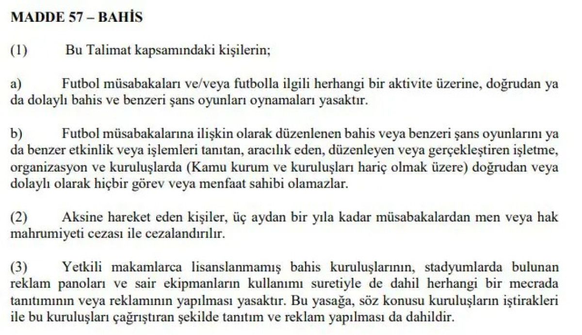 Yetkili makamlarca lisanslanmamış bahis kuruluşlarının, stadyumlarda bulunan reklam panoları ve sair ekipmanlarının kullanımı suretiyle de dahil herhangi bir mecrada tanıtımının veya reklamının yapılması yasaktır. Bu yasağa söz konusu kuruluşların iştirakleri ile bu kuruluşları çağrıştıran şekilde tanıtım ve reklam yapılması da dahildir.”