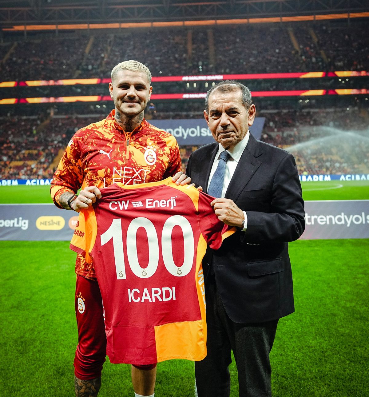 Süper Lig’in 11. haftasında Ali Sami Yen Spor Kompleksi’nde yapılan Trabzonspor mücadelesiyle sarı-kırmızılılarda 100. resmi maçına çıkan Icardi’ye, Galatasaray Başkanı Dursun Özbek, saha kenarında plaket ve üzerinde 100 yazılı sarı-kırmızılı forma takdim etti.