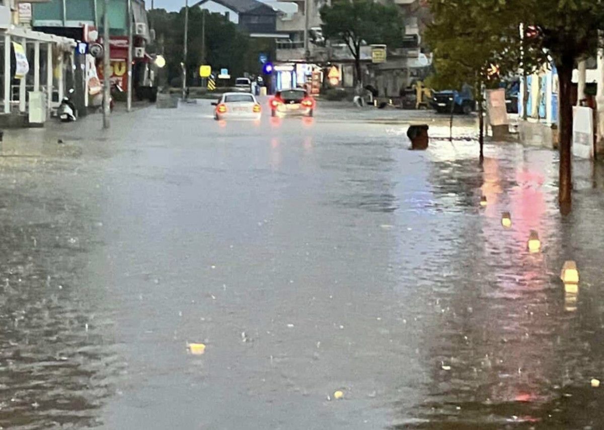 İzmir’in Çeşme ilçesinde sağanak nedeniyle göle dönen cadde ve sokaklar, dronla görüntülendi.